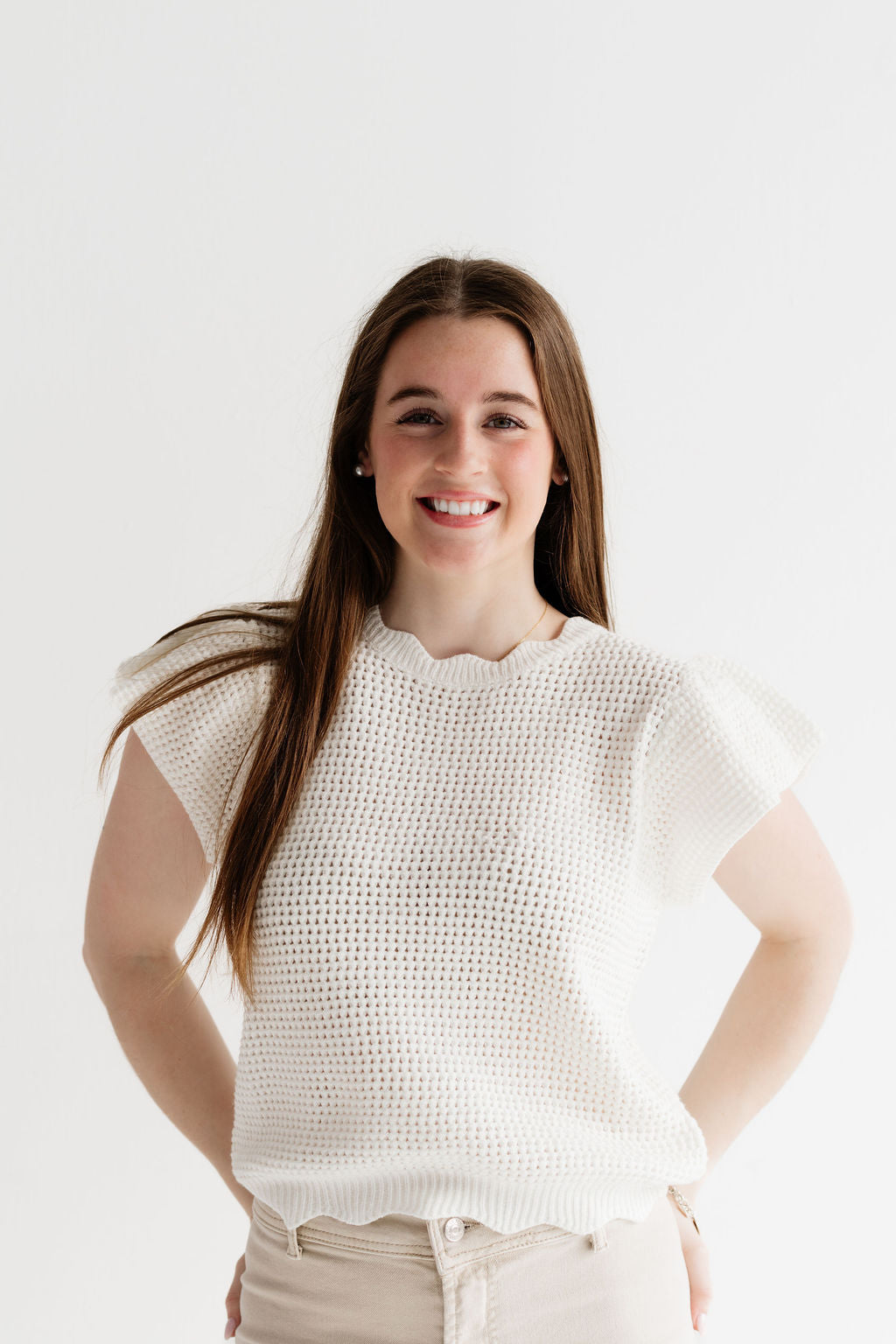 This lightweight knit sweater with subtle flutter sleeves and a ribbed hem for a flattering fit. The breathable knit and easy stretch make it comfortable enough for all-day wear while still looking put together!