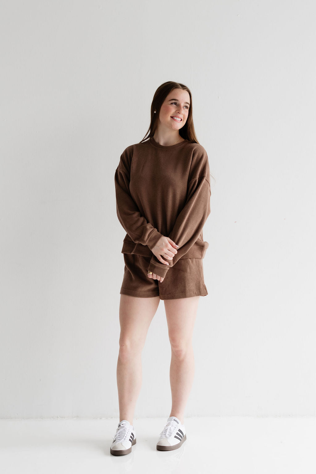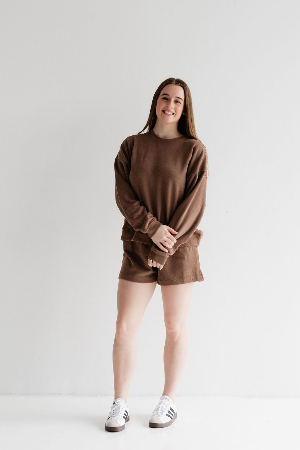 This lounge set includes a relaxed pullover sweatshirt and matching drawstring shorts. The top features a classic crew neckline with an easy, slightly oversized fit, while the shorts are designed with an elastic waistband and adjustable drawstring for all-day comfort. Perfect to wear for travel days, coffee runs, casual weekends, or relaxing at home!